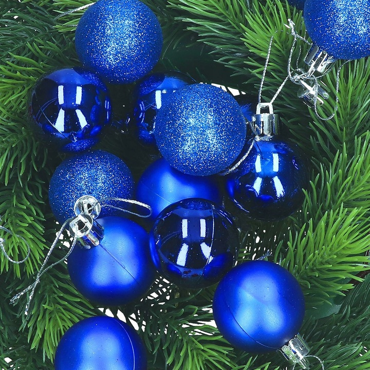Pe lângă decorarea bradului, aceste globuri albastre pot fi folosite și pentru a crea aranjamente deosebite pentru masă sau pentru decorarea ghirlandelor, coroanelor și a altor elemente festive. Combinația de finisaje lucioase, mate și cu sclipici aduce un plus de versatilitate, permițându-ți să creezi decoruri festive unice și adaptate oricărui stil de amenajare, de la tradițional la modern.