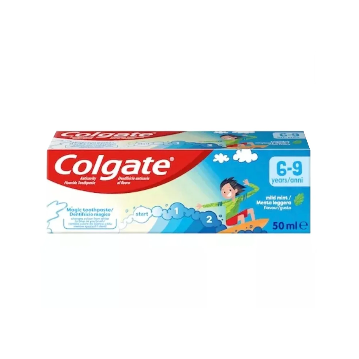 Colgate Pastă de Dinți Menta 50 ml, 6-9 ani – protecție împotriva cariilor, smalț întărit și prospețime plăcută, cu textură blândă potrivită pentru copii.