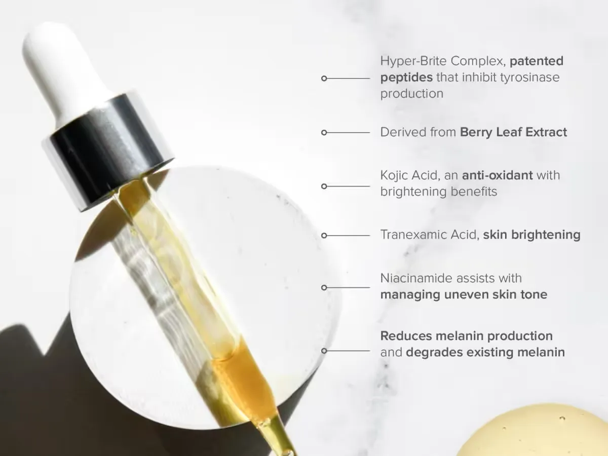 Un ser avansat cu 2% Alpha Arbutin și Hyper Brite Complex, o combinație de Niacinamide, Acid Kojic, Acid Tranexamic și Peptide, special creat pentru corectarea hiperpigmentării, diminuarea petelor post-acneice și uniformizarea tonului pielii. Îmbogățit cu extracte marine și fungi fermentați, acest ser oferă un efect iluminator intens, fără a provoca iritații.
